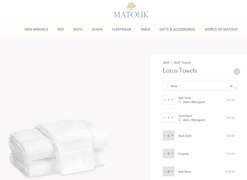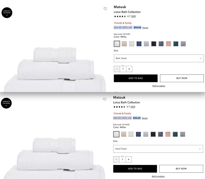 Bloomingdale’s full prices for Matouk towels are significantly inflated, and the current sales offers/prices are misleading. The offer for the bath towel is only 15% off (not 40%), and the Bloomingdales’ sales price for the hand towel ($30.00) is even higher than its regular full price ($27.00).